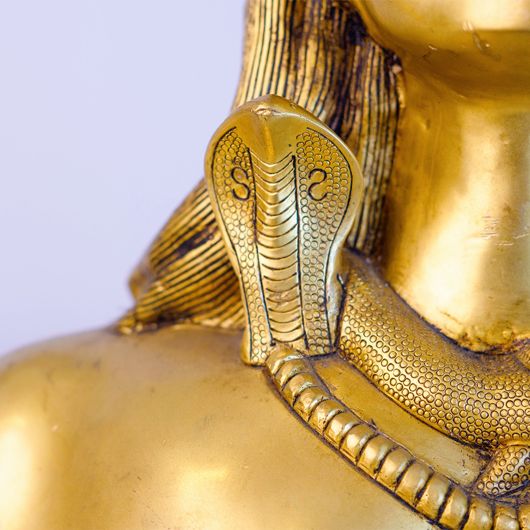 The sculpture captures Shiva’s calm yet powerful expression, adorned with: