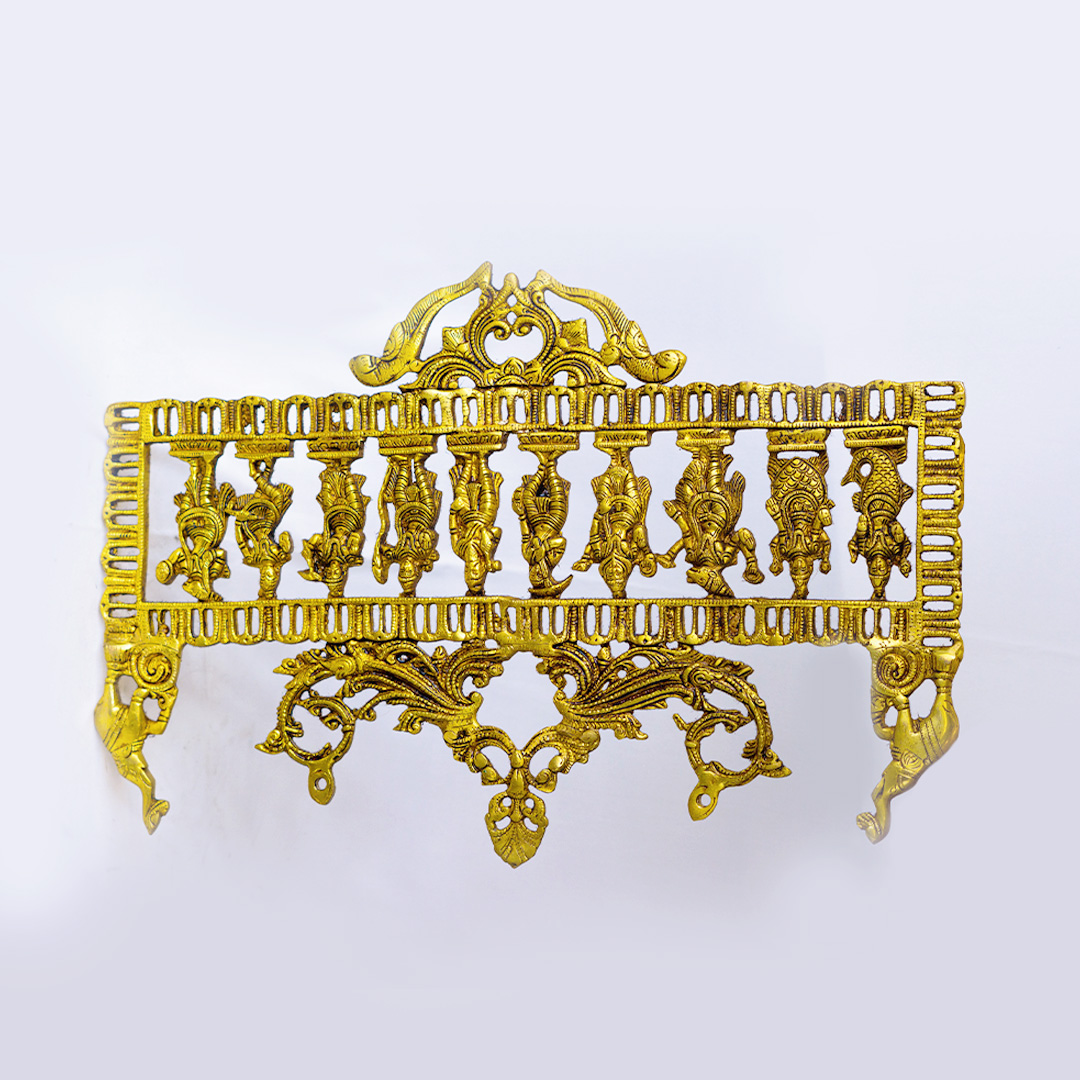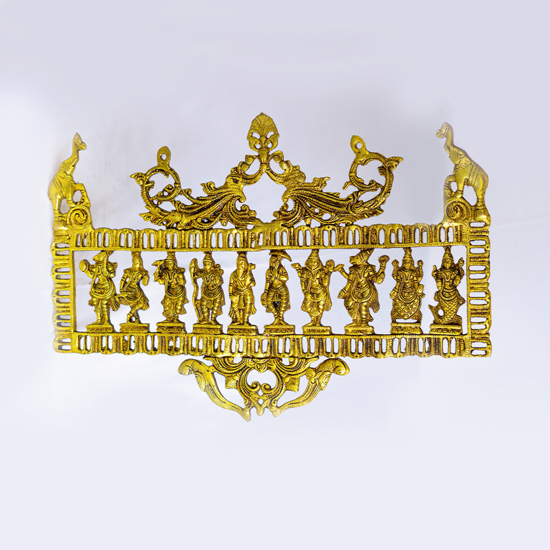 This exquisite Brass Dashavatharam Wall Panel depicts the ten divine incarnations of Lord Maha Vishnu, each sculpted with intricate detail in traditional Kerala temple craftsmanship. The open lattice-style casting work enhances visibility of each avatar, making it a striking centerpiece for pooja rooms, temple walls, meditation spaces, and cultural interiors.