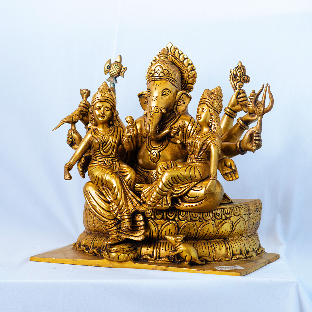 This exquisite brass idol depicts Lord Ganesha, the remover of obstacles and the harbinger of success, seated gracefully with Riddhi (Prosperity) and Siddhi (Spiritual Power / Knowledge) beside him. Together, they represent a complete and fulfilled life—wealth + wisdom + happiness + spiritual balance.