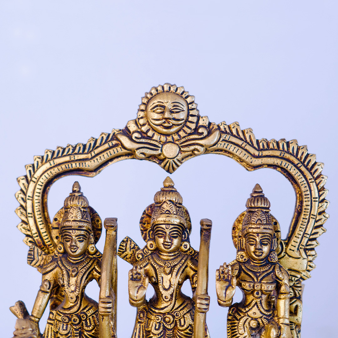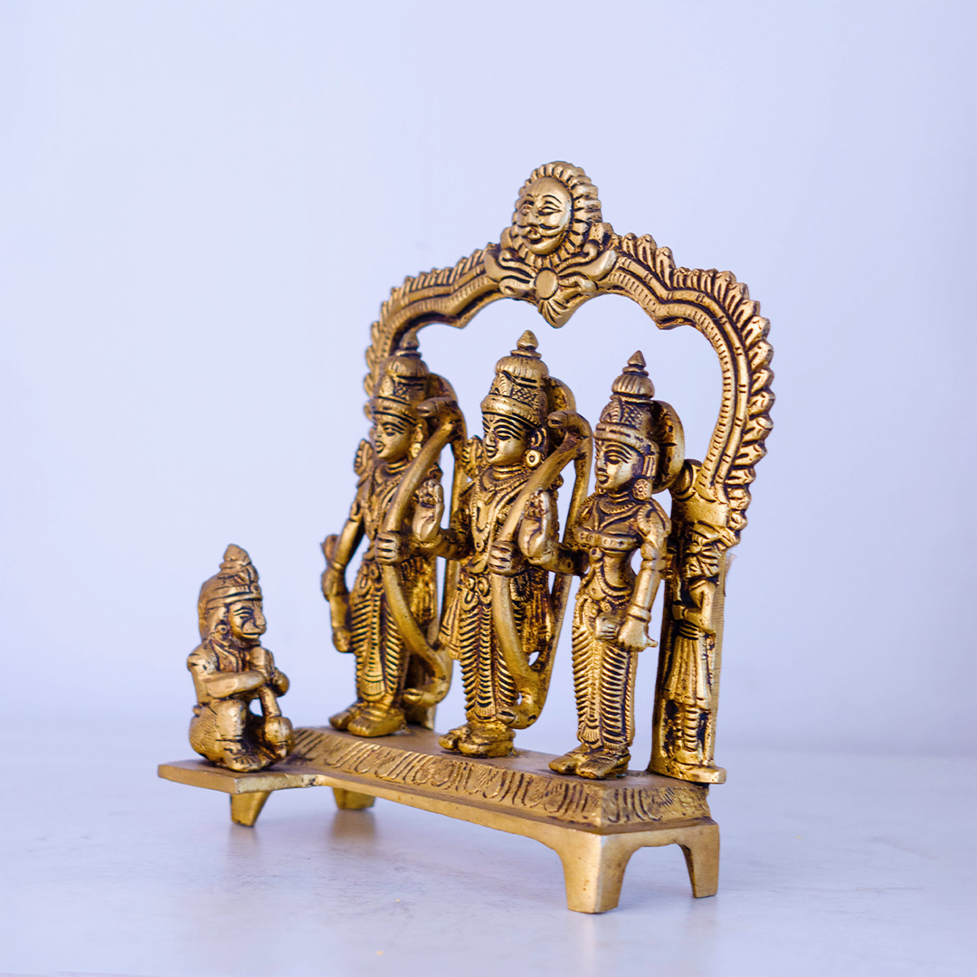 This elegant brass sculpture captures the divine moment of Sri Rama’s Pattabhishekam (Coronation). Lord Rama stands at the center with Sita Devi by his side, Lakshmana holding the bow, and Hanuman kneeling in devotion. The arch (Prabhavali) above symbolizes divine radiance and cosmic order. The fine detailing in ornaments and posture reflects classic South Indian temple art.