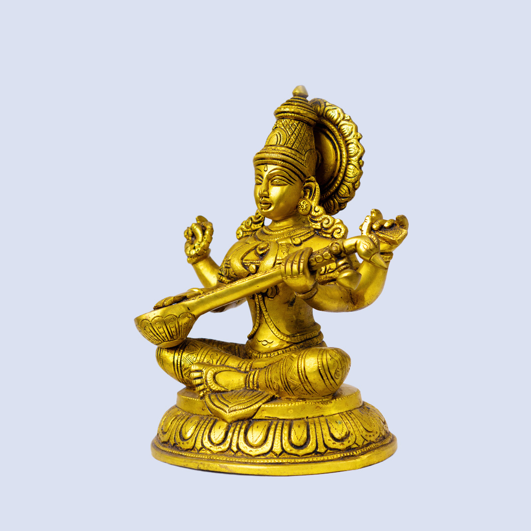The intricate detailing—from the crown and ornaments to the flowing drapery and lotus base—reflects fine artisanal skill passed down across generations. Cast in solid brass, this idol is ideal for pooja rooms, home temples, learning spaces, music rooms, meditation corners, and altars.