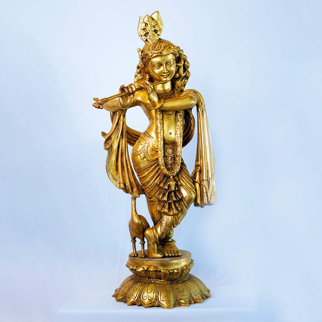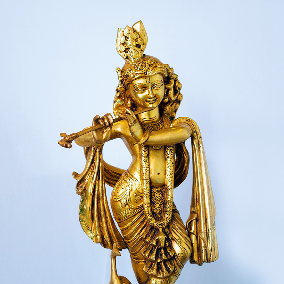 The detailed craftsmanship, flowing drapery, serene expression, and lotus-style pedestal create a captivating aura that transforms any space into a sacred refuge of love and devotion. Placing Venugopal at home is believed to invite harmony in relationships, strengthen love within the family, and bring mental peace and emotional balance.