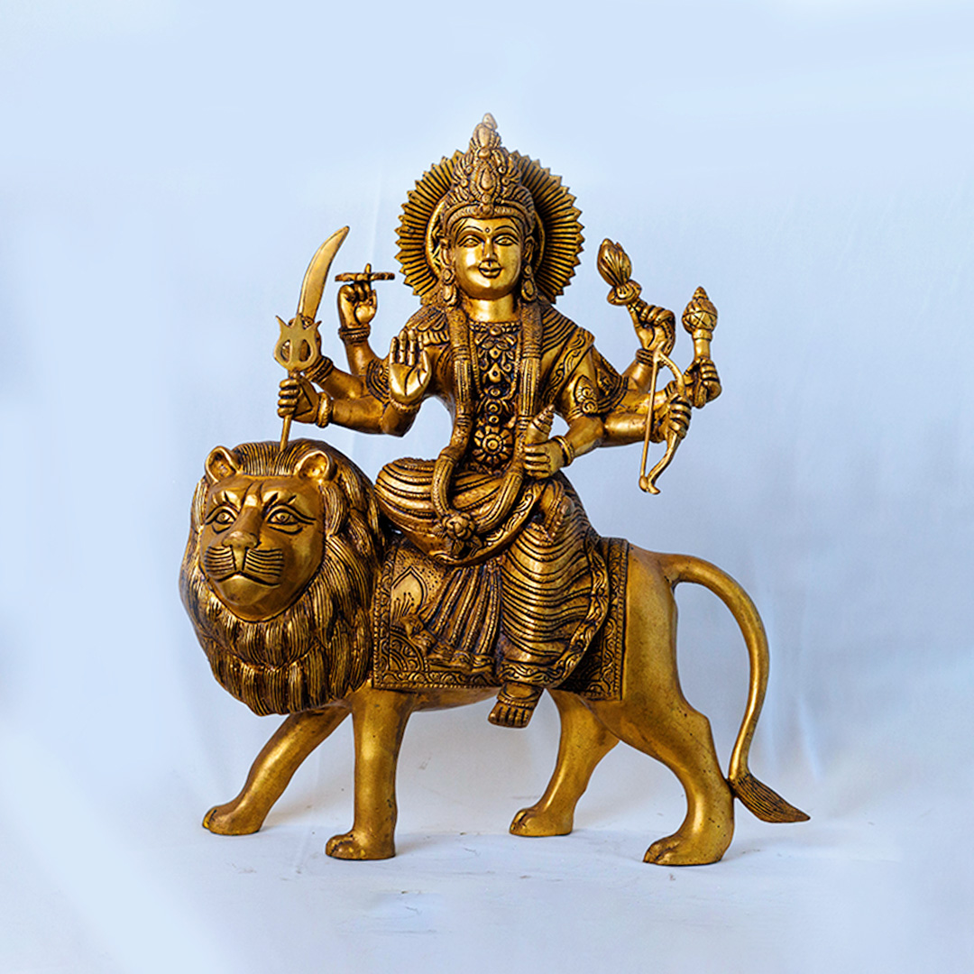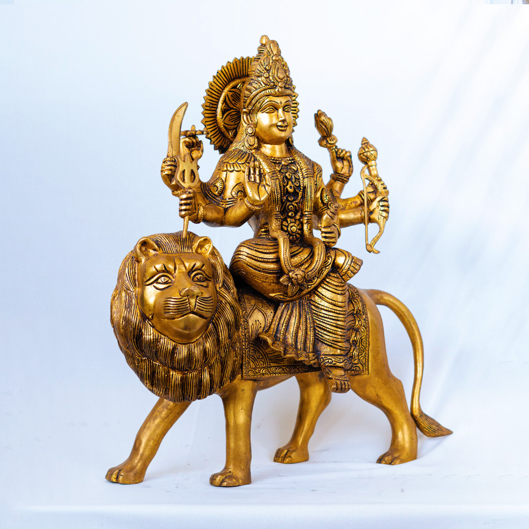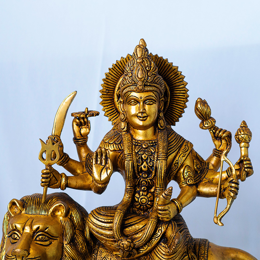 This exquisite Brass Durga on Lion statue represents Maa Durga in her divine warrior form, riding her vahana Simha, the symbol of power, righteousness, and victory over negativity. Every detail—from her serene yet fearless expression to the finely carved ornaments and weapons—reflects extraordinary craftsmanship.