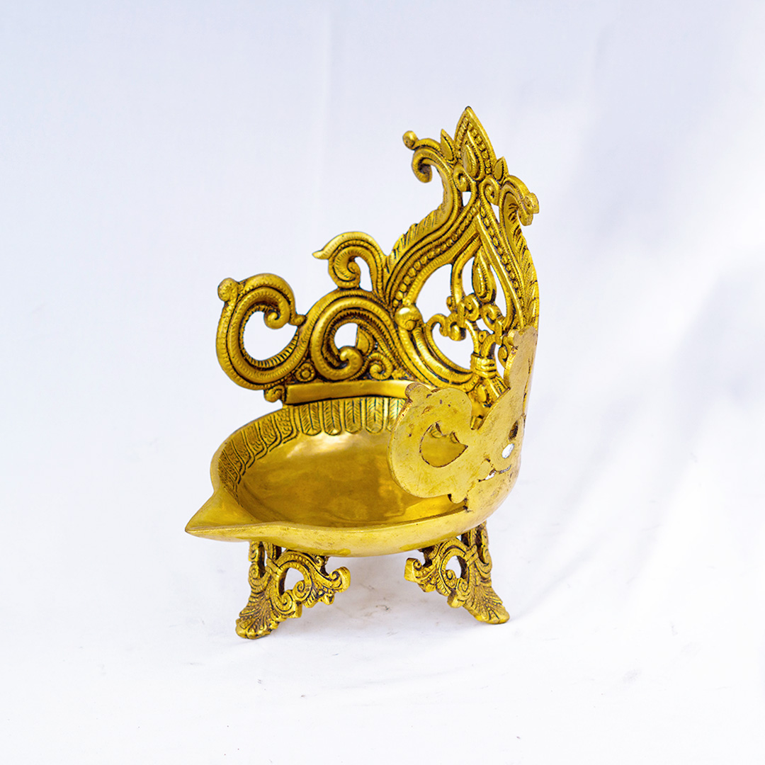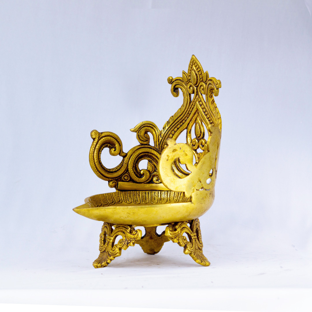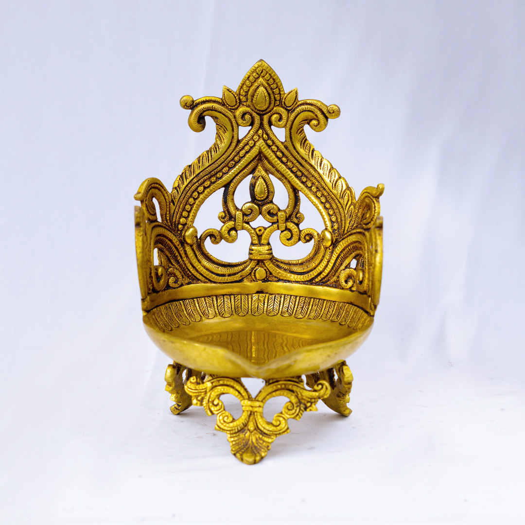 This Designer Brass Temple Diya embodies the essence of Kerala’s classical temple artistry. Handcrafted from pure brass, it features a deep diya bowl for holding oil or ghee, supported by intricately carved legs and crowned with an ornate temple-style backplate.