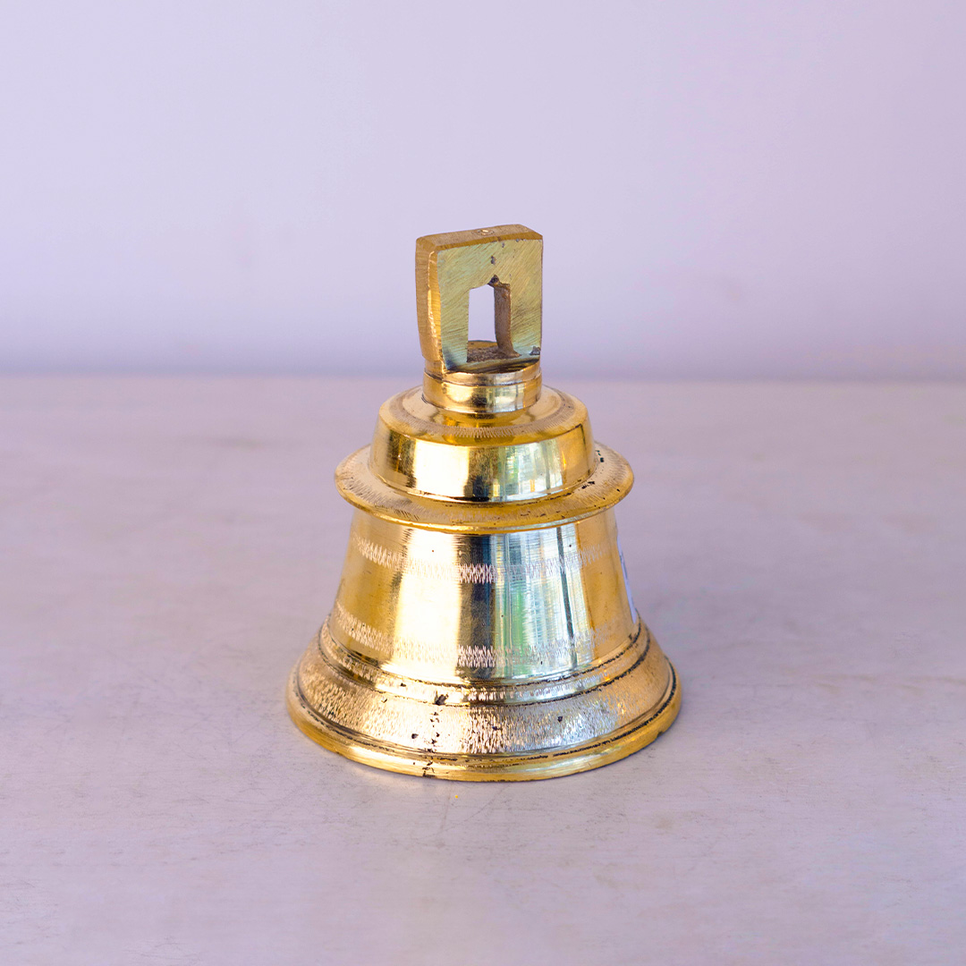 This handcrafted brass puja ghanti is made in the traditional Kerala temple style. The bell has a thick, weighty body that ensures a deep and steady resonance when rung. In Hindu ritual practice, the sound of the bell symbolizes the removal of negative energy and the invitation of divine presence.